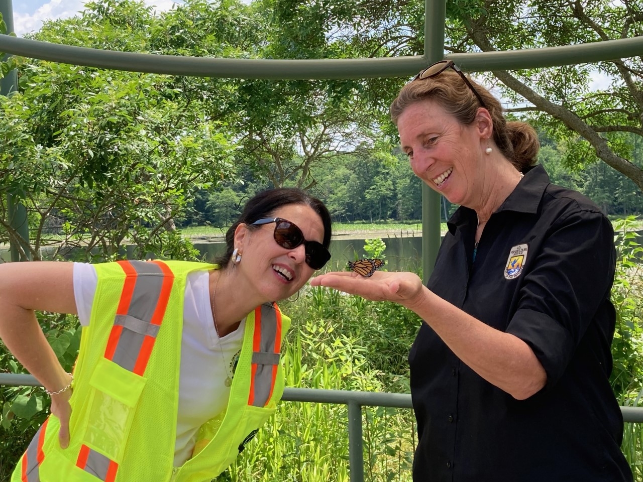 Fish & Wildlife Director Martha Williams and Assistant Secratary Fish, Wildlife and Parks Shannon Estenoz admire a monarch butterfly.