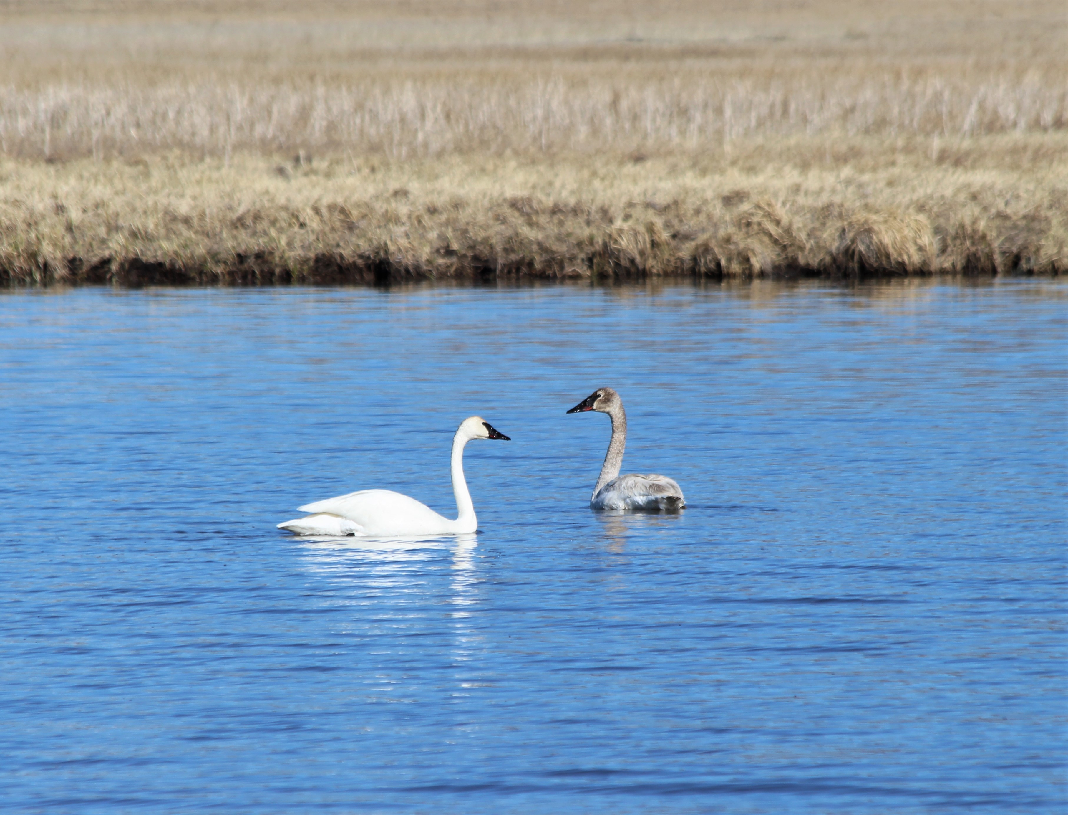 An adult and cygnet trumpeter swan swimming at red Rock Lakes National Wildlife Refuge. Photo by Cortez Rohr/USFWS