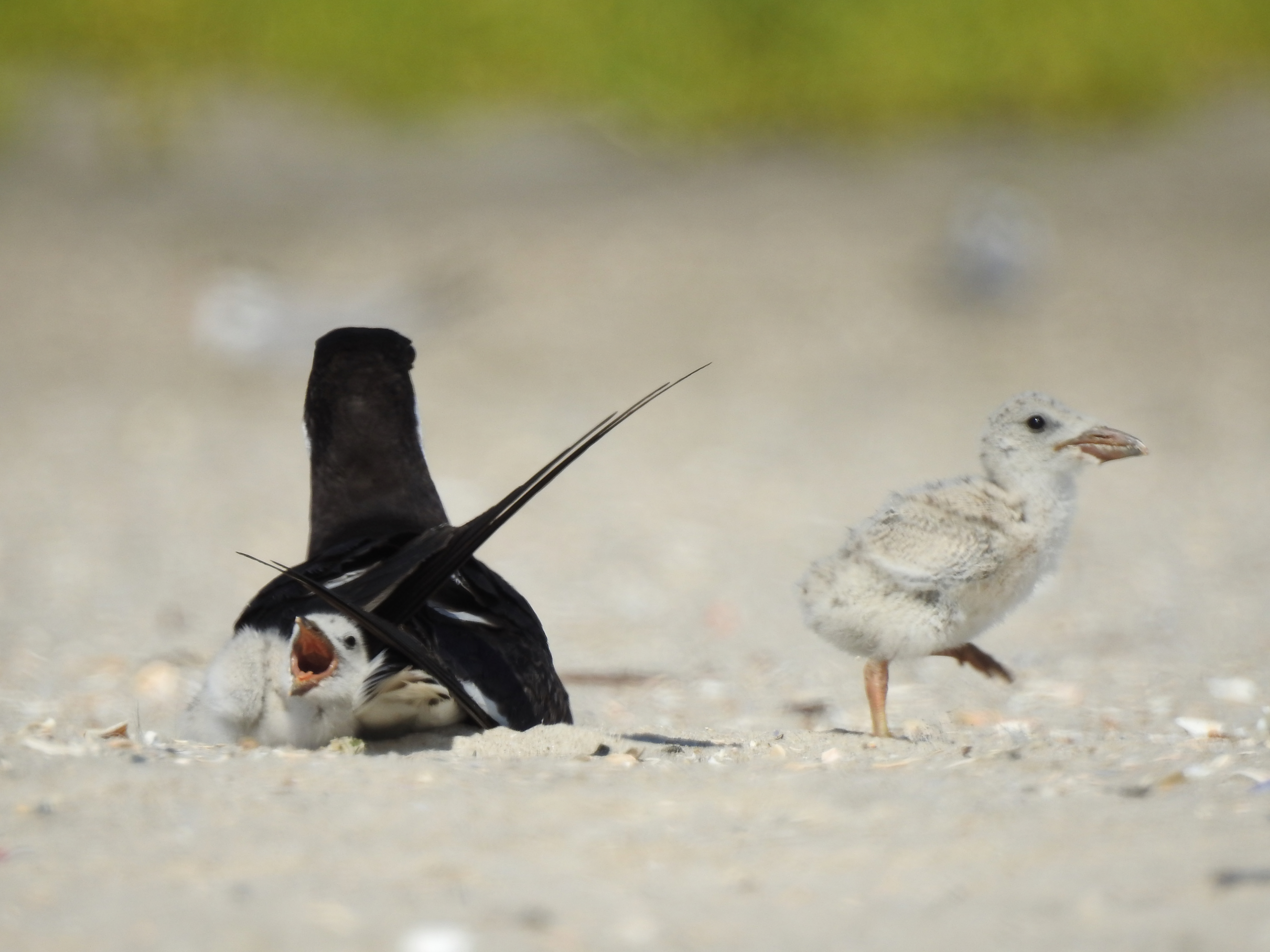 Adult black skimmer sitting with its chicks at Silver Point County Park, New York. This species is of special concern in New York State.
