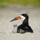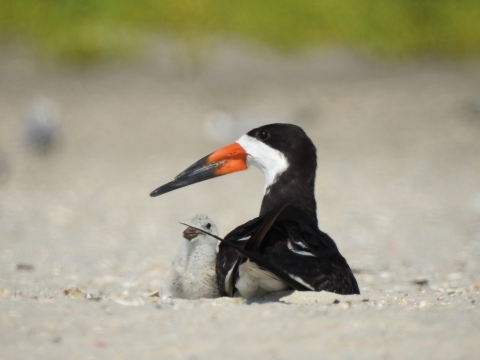 Adult black skimmer sitting with its chicks at Silver Point County Park, New York. This species is of special concern in New York State.