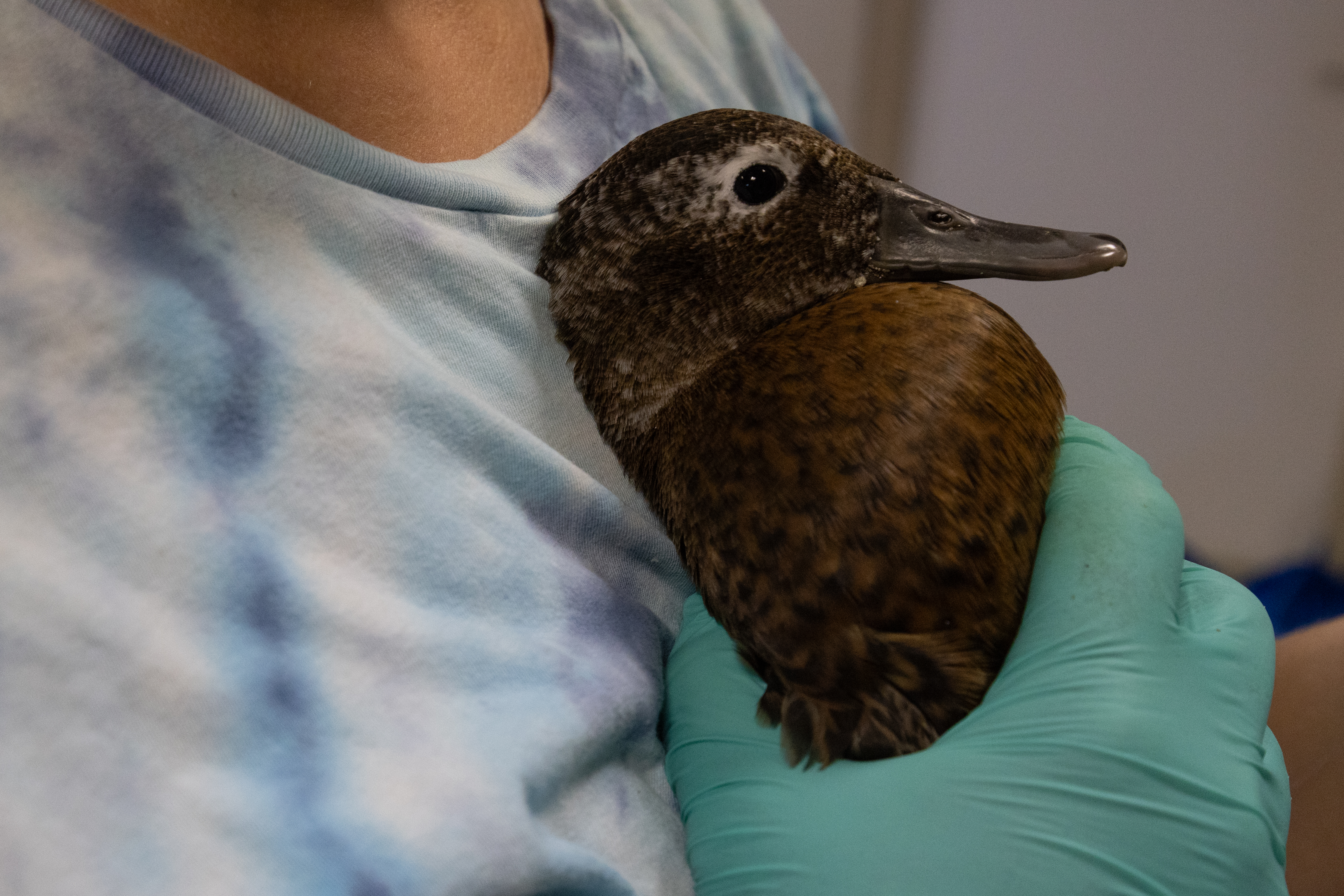 An adult endangered Laysan duck in the Duck Lab on Midway Atoll National Wildlife Refuge during the Seabird Protection Project.