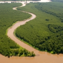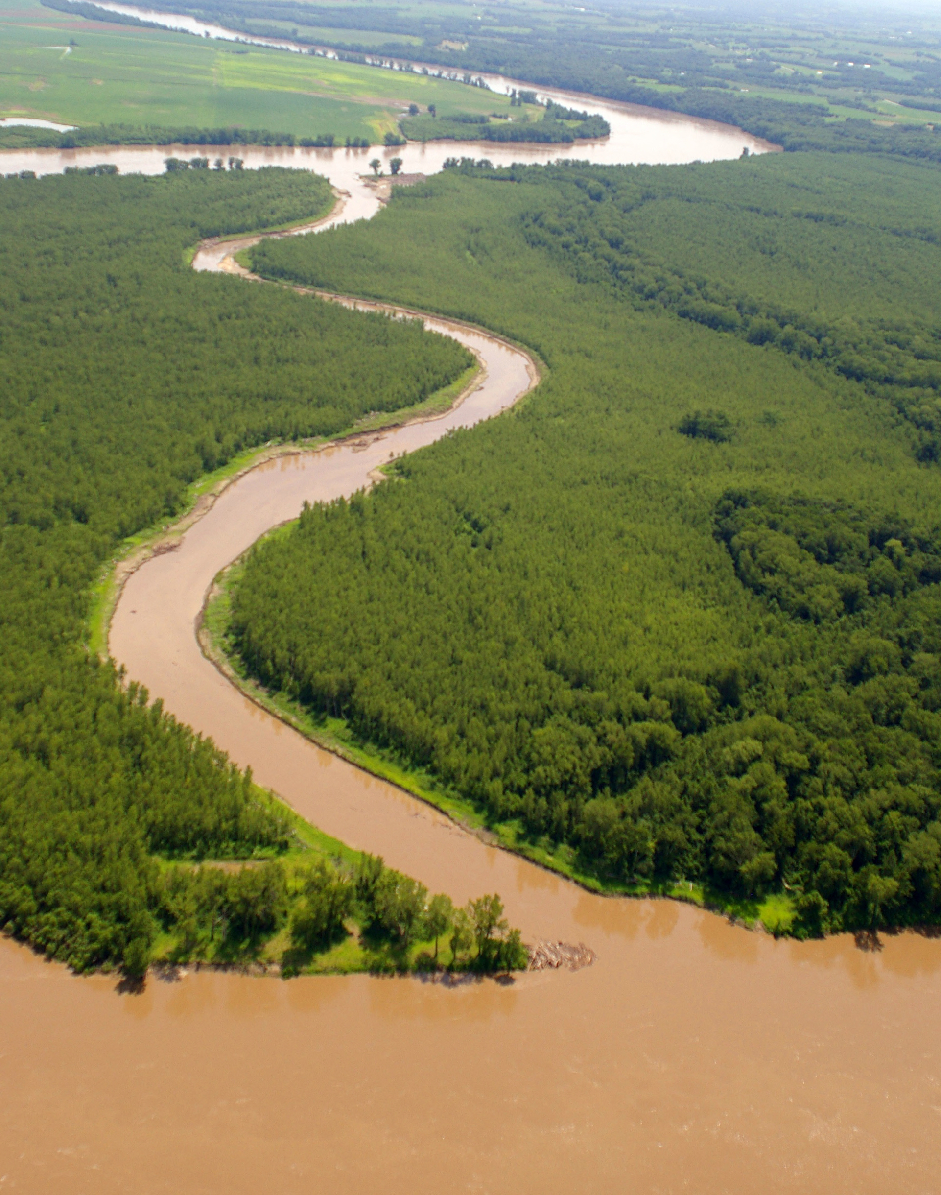 Aerial view of Jameson Island in the Missouri River from C. Bittner, looking south; muddy red river twisting through floodplain.