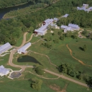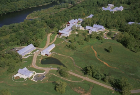 Aerial of the National Conservation Training Center campus with green trees and the Potomac River.