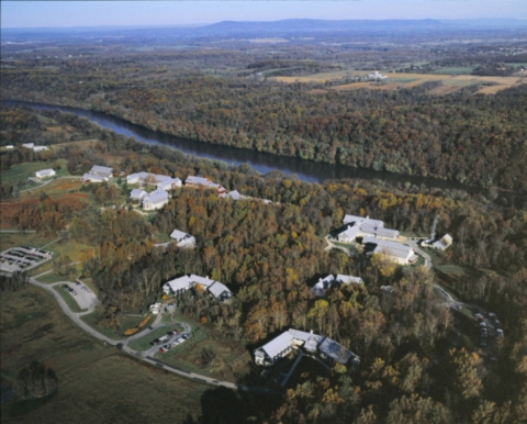 Aerial of the National Conservation Training Center campus beside the Potomac River and with western Maryland in the distance.