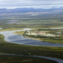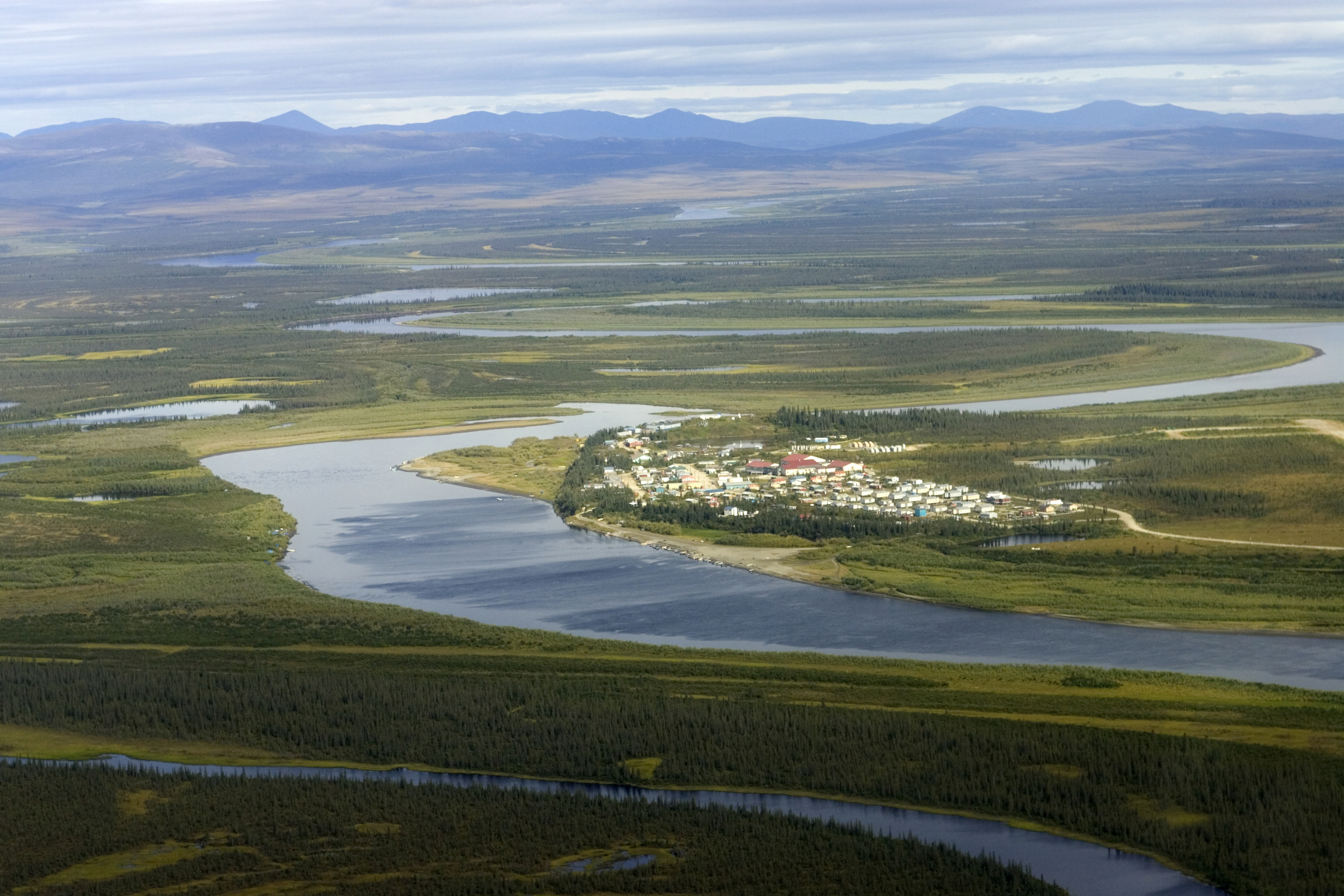 Aerial photo of a village, a waterway, and mountains in a remote area of Alaska