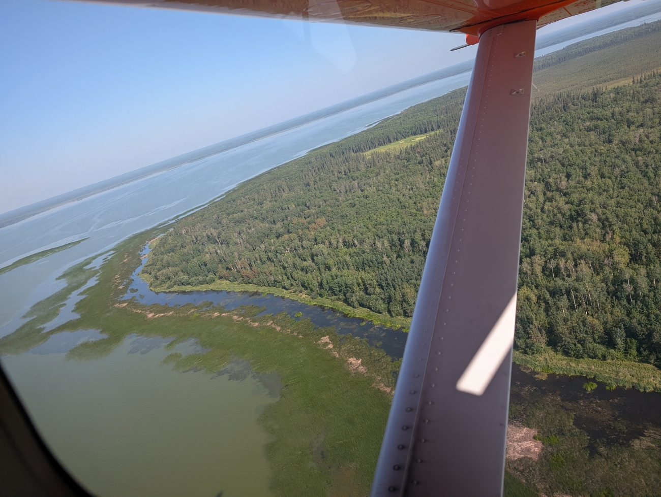 Our 2024 waterfowl banding station at Lake Utikuma in Alberta as viewed from the air during an aerial recon survey. If you squint you might be able to see ducks around the vegetation line!