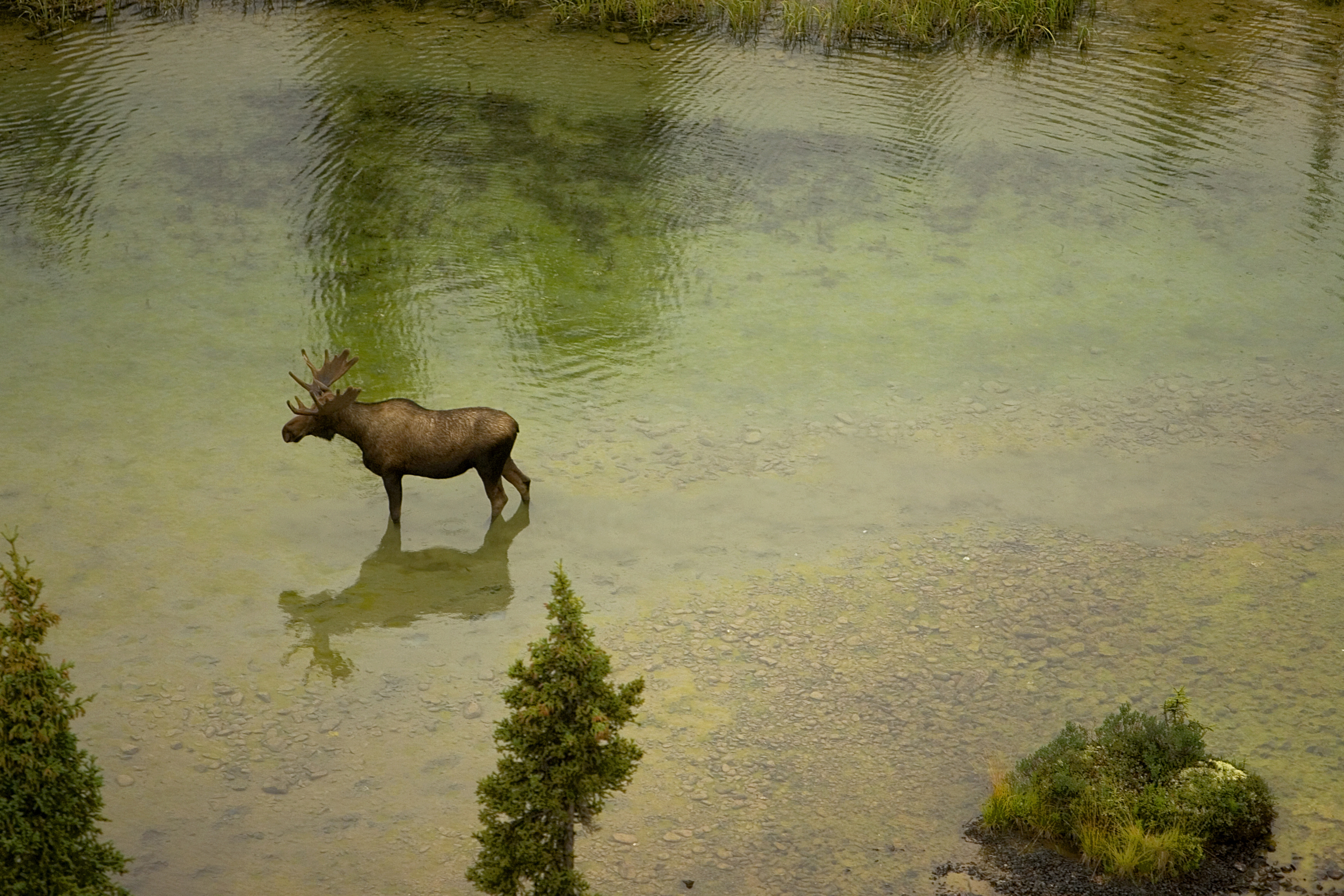 This is an aerial view of a moose and his reflection in the water. Alaska is a land of awe-inspiring beauty and fish and wildlife spectacles, and the Kenai National Wildlife Refuge is a microcosm of all this wonderful state has to offer.