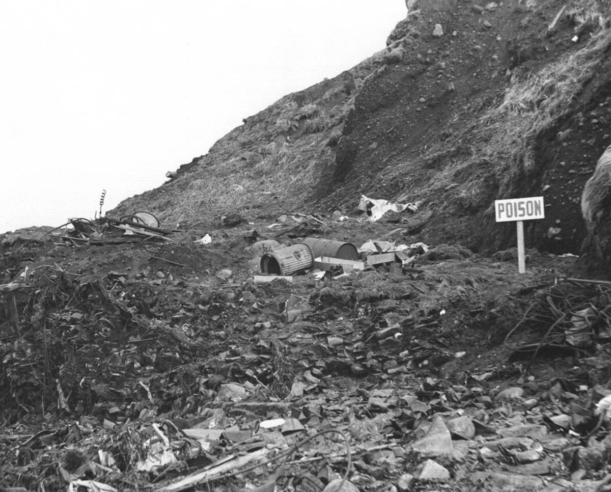 Consolidated Army, Navy, Air Force dump, Amchitka Island, Aleutians, Rat Harbor location shows one of the aftermaths of war including the introduction of rats introduced on a hitherto uninfested island. The dump attracts rats. Note: Sign "Poison"
