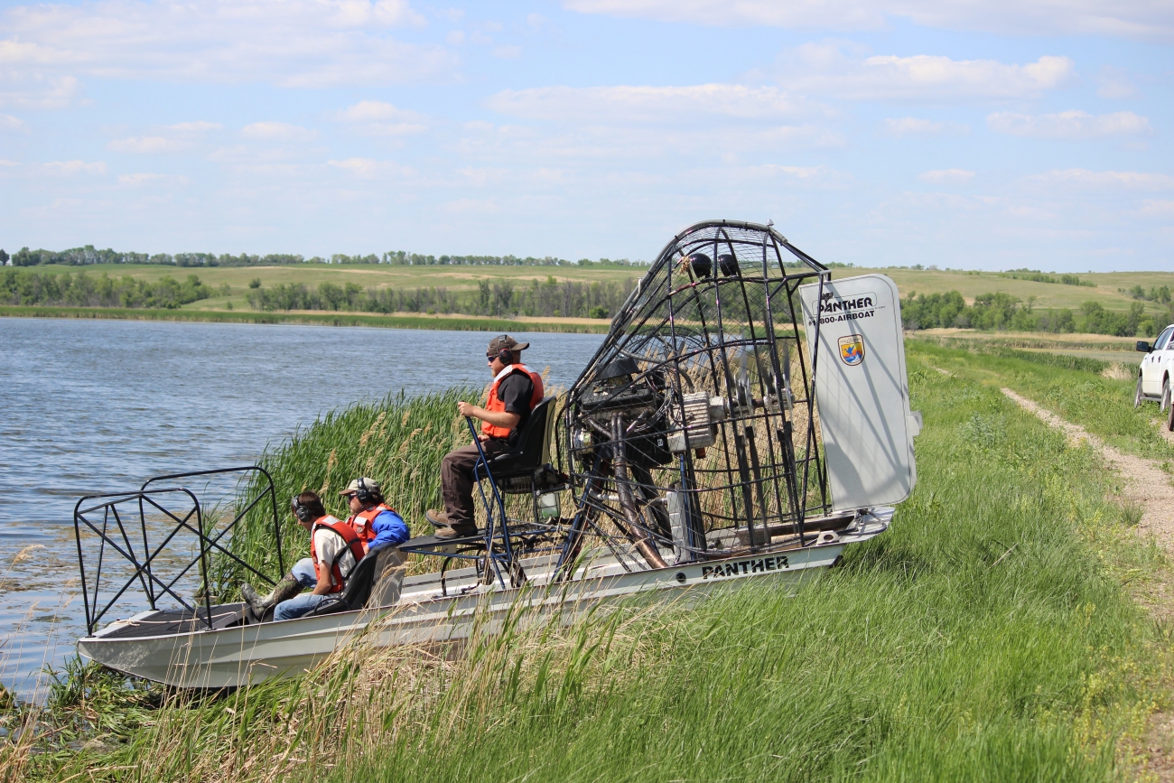 A Motorboat and Airboat Safety Training was held at the Upper Souris National Wildlife Refuge in North Dakota. Students received classroom training as well as field training in the use of personal flotation devices (PFDs), various motorized boats, trailers, and airboats. Students had to pass both a written exam and a practical exam where both safety and slikks were demonstrated while running set up courses.