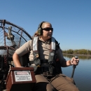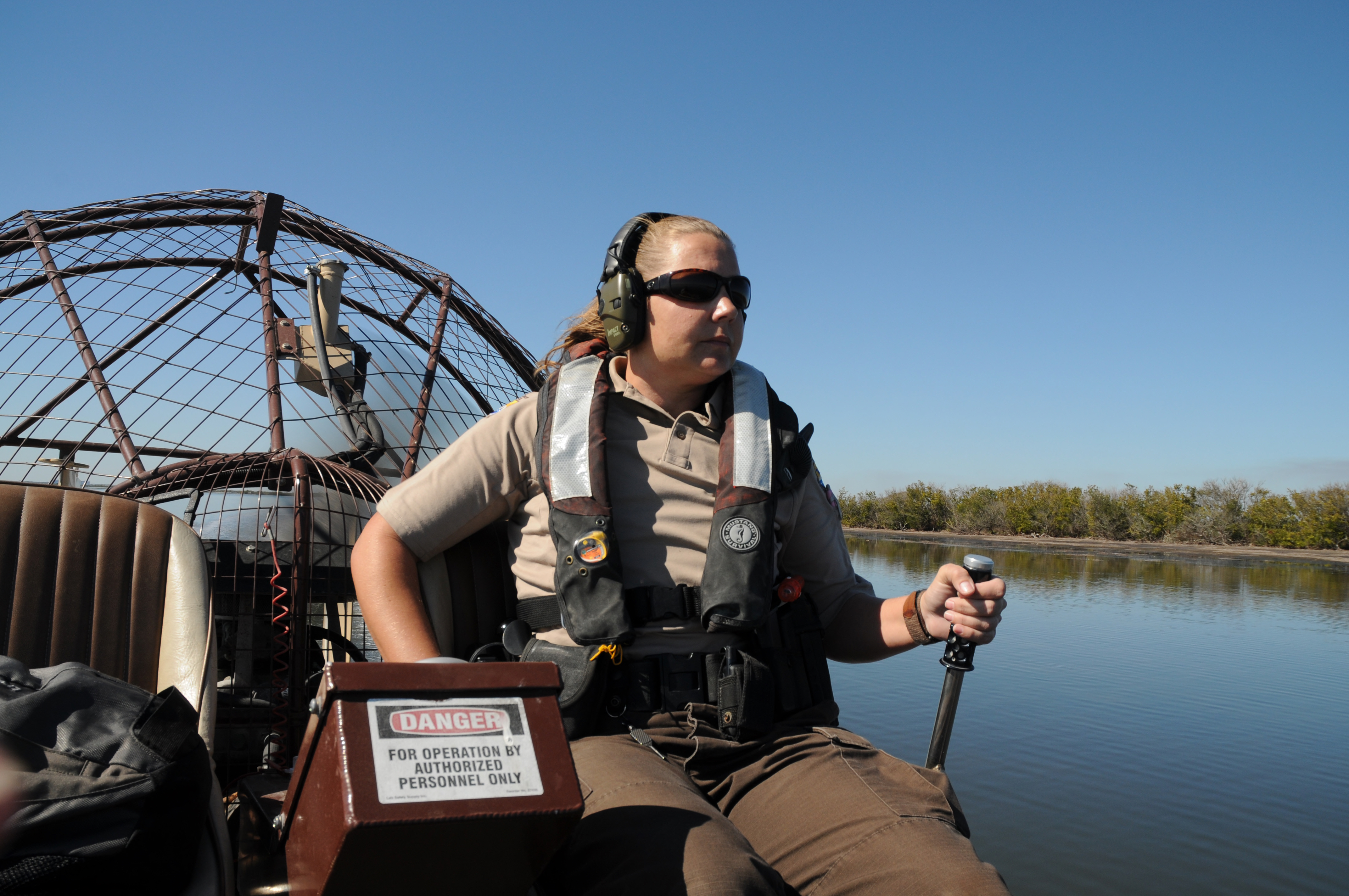 This picture is of a female U.S. Fish and Wildlife Service Law Enforcement Officer, Jane Whaley, on patrol by airboat.