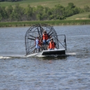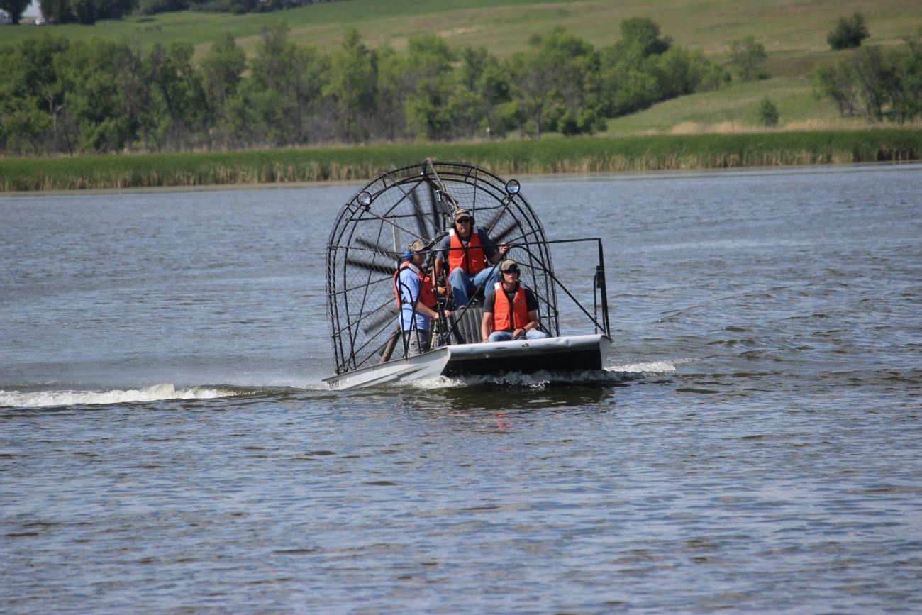 A Motorboat and Airboat Safety Training was held at the Upper Souris National Wildlife Refuge in North Dakota. Students received classroom training as well as field training in the use of personal flotation devices (PFDs), various motorized boats, trailers, and airboats. Students had to pass both a written exam and a practical exam where both safety and slikks were demonstrated while running set up courses.