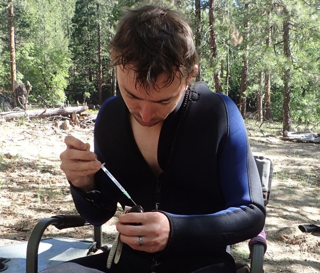 Alex Jones, biologist with the USFWS collects samples from freshwater mussels in the Klamath Basin.