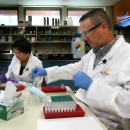 Randal Logues and Rachel DeWilde from USFWS’s Conservation Genetics Lab extract DNA from Yukon River Chum Salmon fin clips that have been flown into Anchorage. Each year this lab analyzes approximately 3,000 of these tiny samples over the course of the summer and fall to aid fisheries managers’ decision-making in real time.