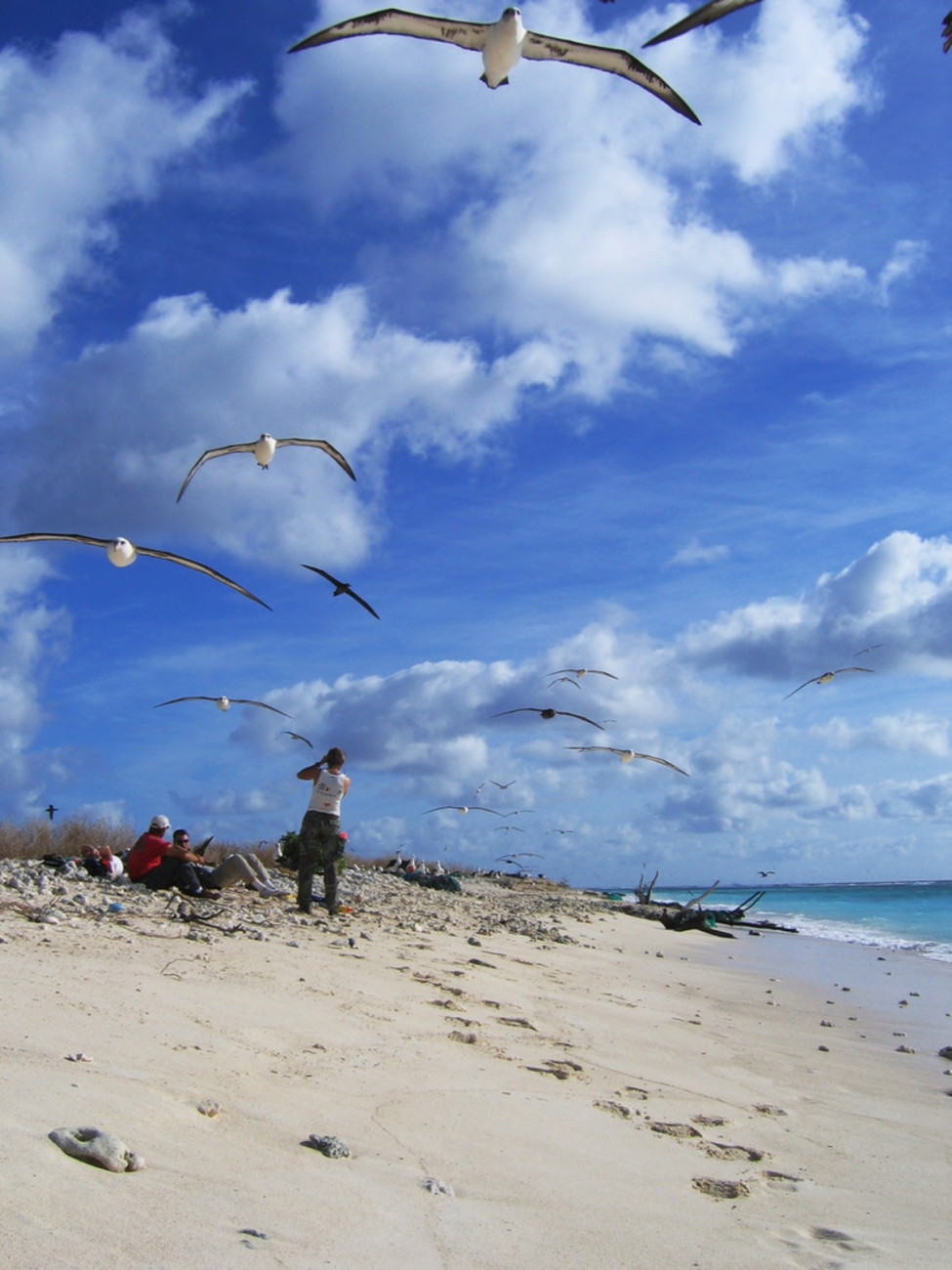 Albatross in flight on Eastern Island in the Midway Atoll National Wildlife Refuge. Nest census volunteers take a break and observe albatross gliding.