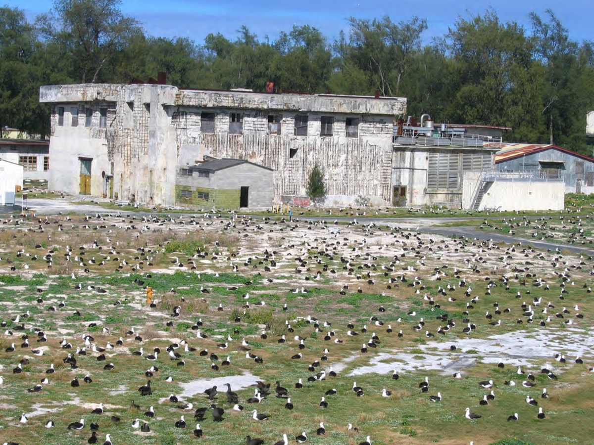 Albatross nest in the area surrounding a historic building on Sand Island, Midway Atoll National Wildlife Refuge.