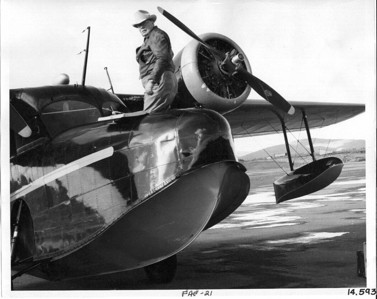 Nome, Alaska. Grumman Goose patrol plane used by the Fish and Wildlife Service in Alaska. Albert M. Day, Director of the Service is standing in cargo pit in bow of the plane. FWS-6625