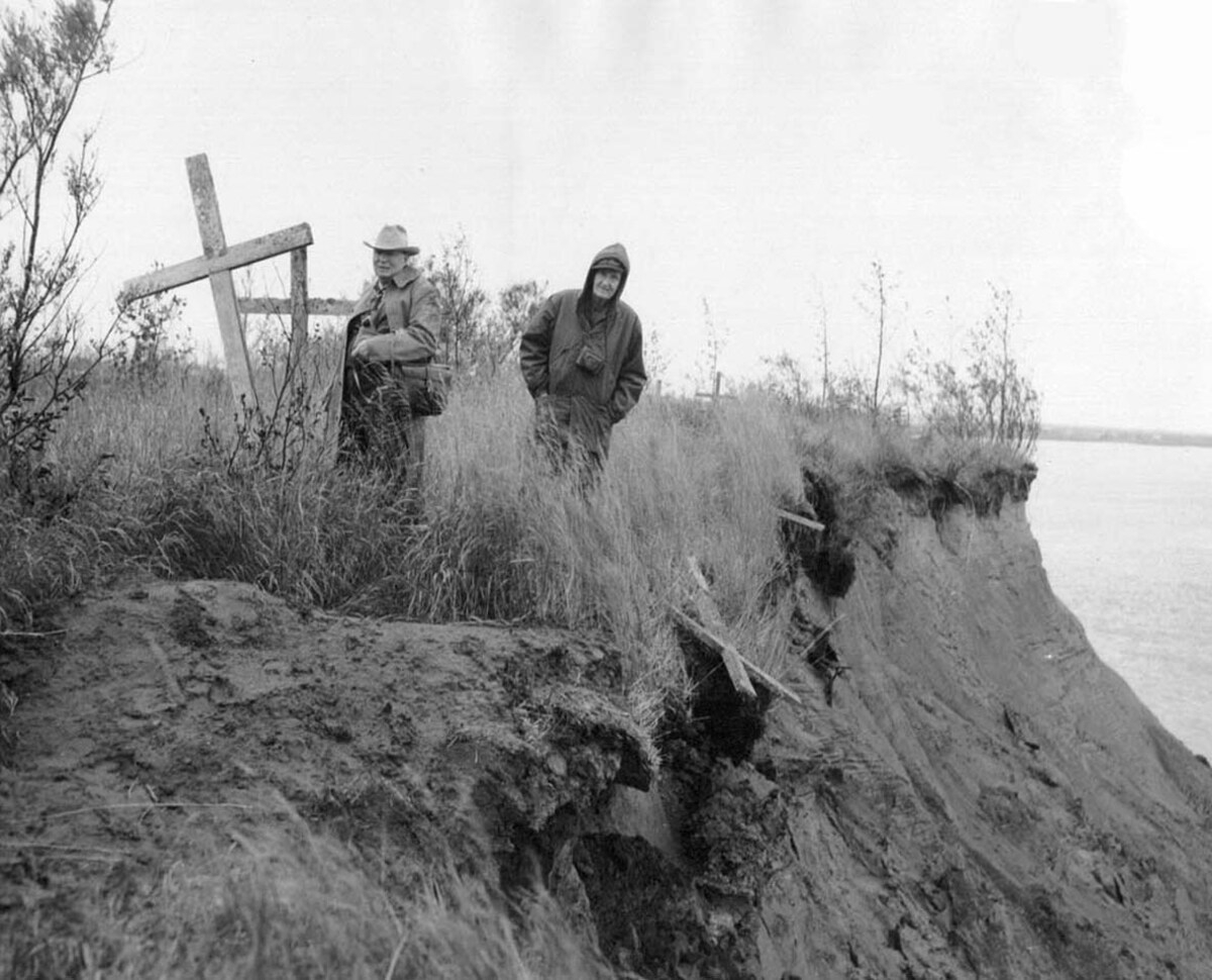 Bethel, Alaska. Albert M. Day, Director of the U.S. Fish and Wildlife Service; and L.T. Oldroyd of the University of Alaska, inspecting the Bethel Cemetery. This cemetery was undermined by the Kuskokwim River just above the city water intake. The Pribilof Report 1949;