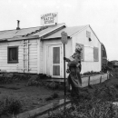 The Pribilof Report 1949. Wildlife Refuge sign outside the Mekyoruk Native Alaskan Store. Albert M. Day, Director of the Fish and Wildlife Service, pauses to look at it. FWS-1177
