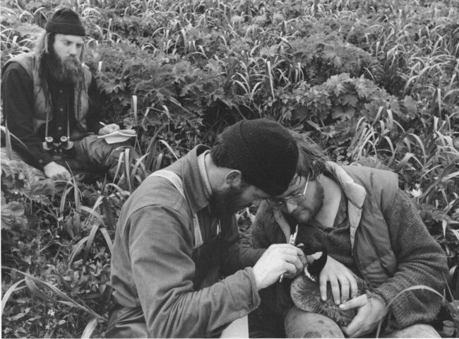 Aleutian Canada Goose Project. Buldir Island. L-R: John Trapp, Vern Byrd (project leader), Dennis Woolington (also followed geese on their California wintering grounds); Goose; Geese; Alaska Maritime National Wildlife Refuge; Aleutians; ARLIS; Alaska; FWS-6636
