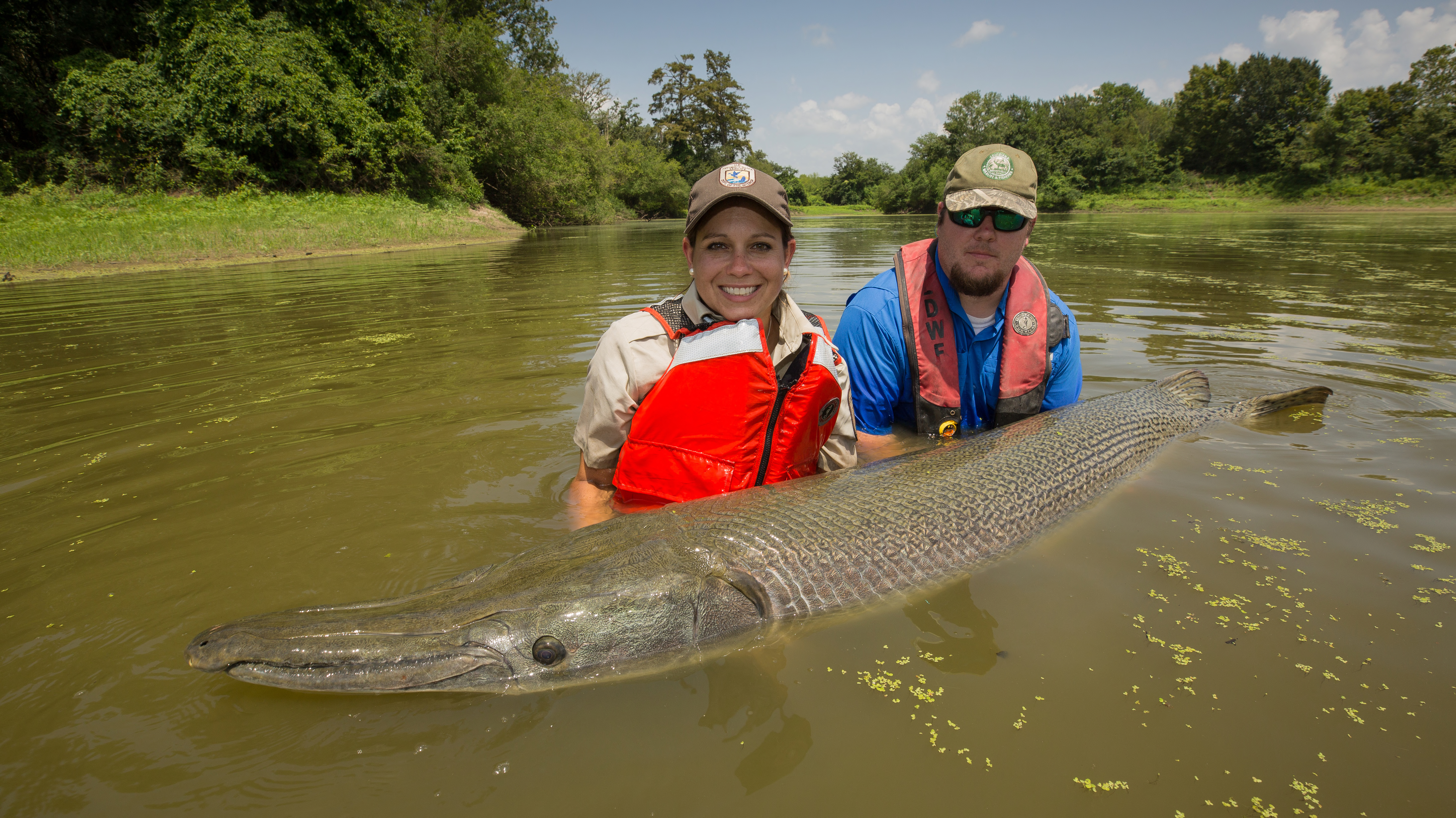 Biologists holding gar in the water