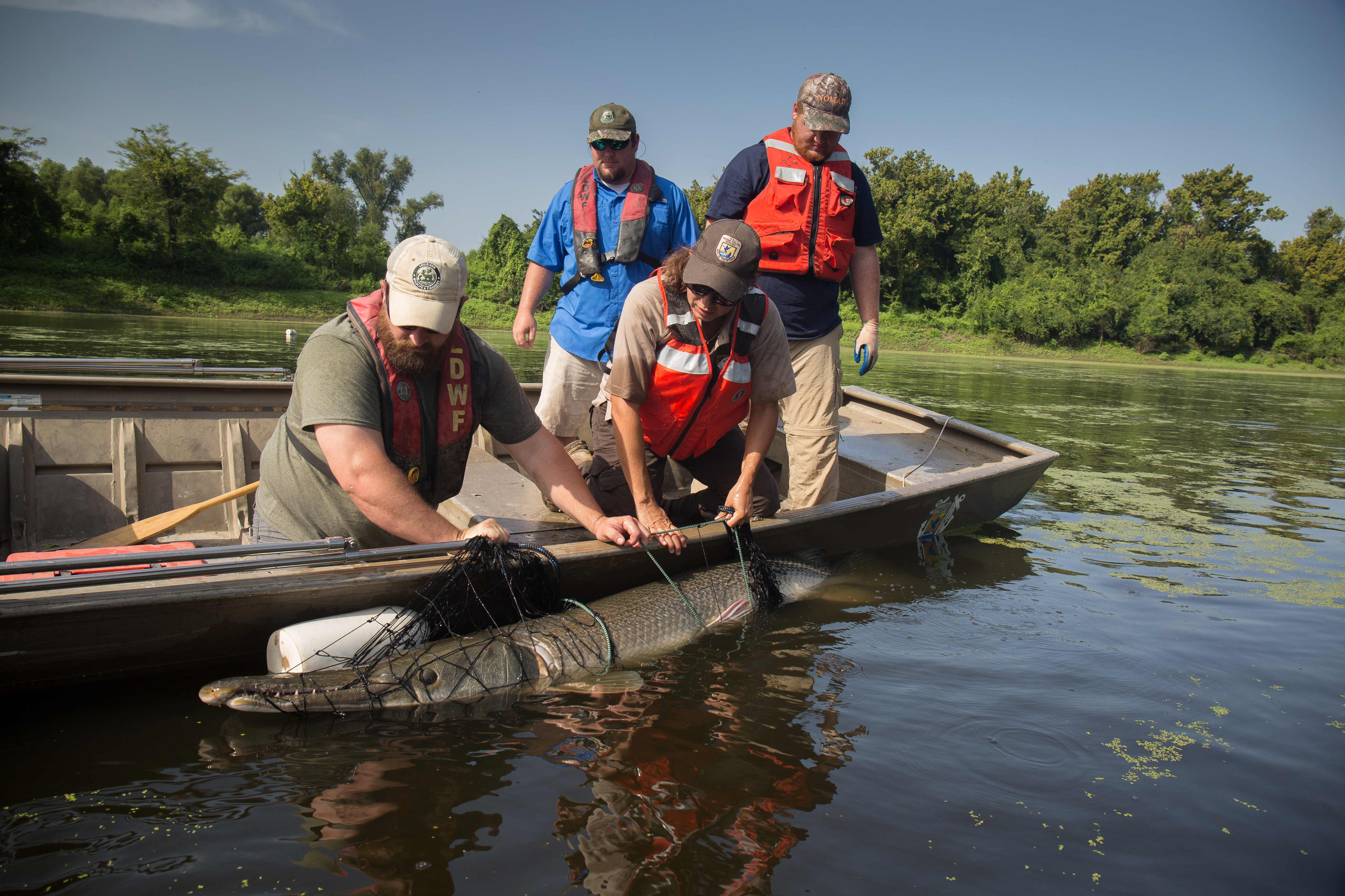 Biologists capture gar with gill nets in Mississippi