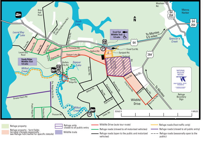 Roads and units in magenta are closed to all entry. Roads in green are open for walking and biking and closed to motorized vehicles. Roads in gold are open to foot traffic only. More details about the closures can be found under Current Road Conditions on our website, fws.gov/refuge/alligator-river.