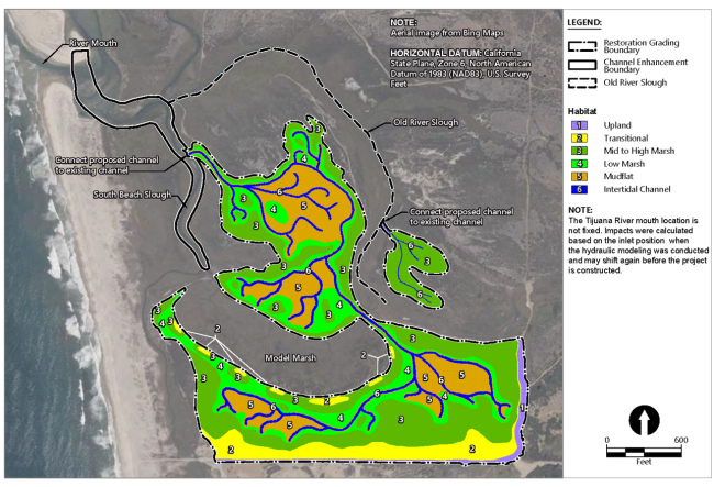 This is a detailed restoration plan for Alternative 1. Shown are four general areas of mudflat habitat surrounded by a thin area of low marsh that is surrounded by a wider area of mid to high marsh, all located within the main restoration area. The areas are situated generally to the north and south of the previously restored Model Marsh, and will be fed by newly created intertidal channels that connect to the South Beach Slough. Another small restoration area, located to the east of the larger restoration site, is connected to the Old River Slough and is proposed for mid to high marsh habitat. Existing native transitional habitat would be preserved along the southern boundary of the main restoration site, with native upland habitat present along the southern and eastern edge of the transitional habitat. Small areas of transitional habitat will also be created along the southern edge of the previously restored Model Marsh.