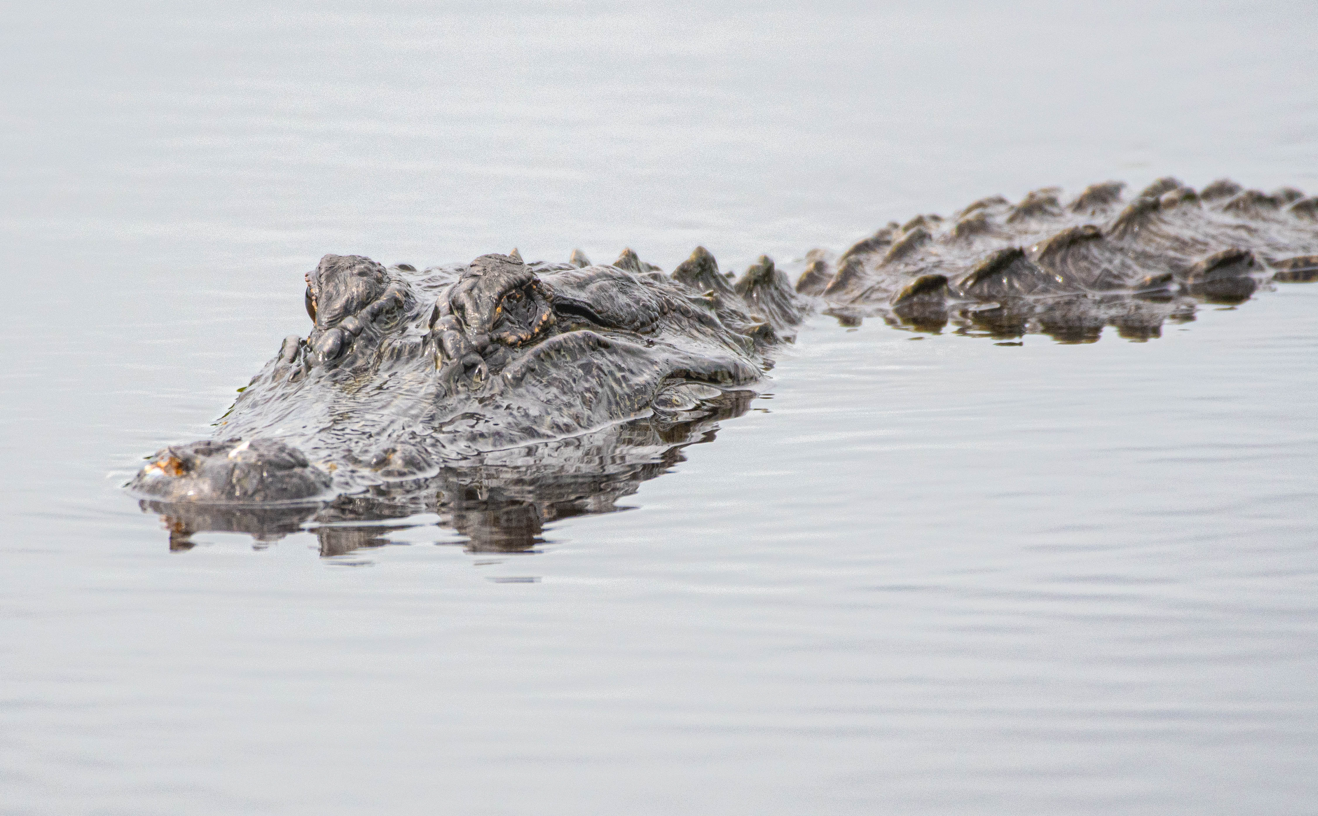 An American alligator floats partially submerged in a wetland