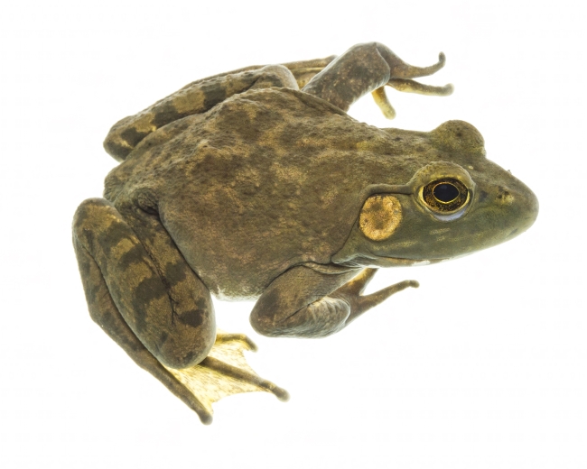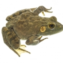 American bullfrog at Gavins Point National Fish Hatchery at Yukton, South Dakota. The baritone call of the bullfrog is so deep and resonant it resembles to mooing of a cow, hence its name. These frogs are nocturnal predators and will eat just about anything that can fit into their mouths.