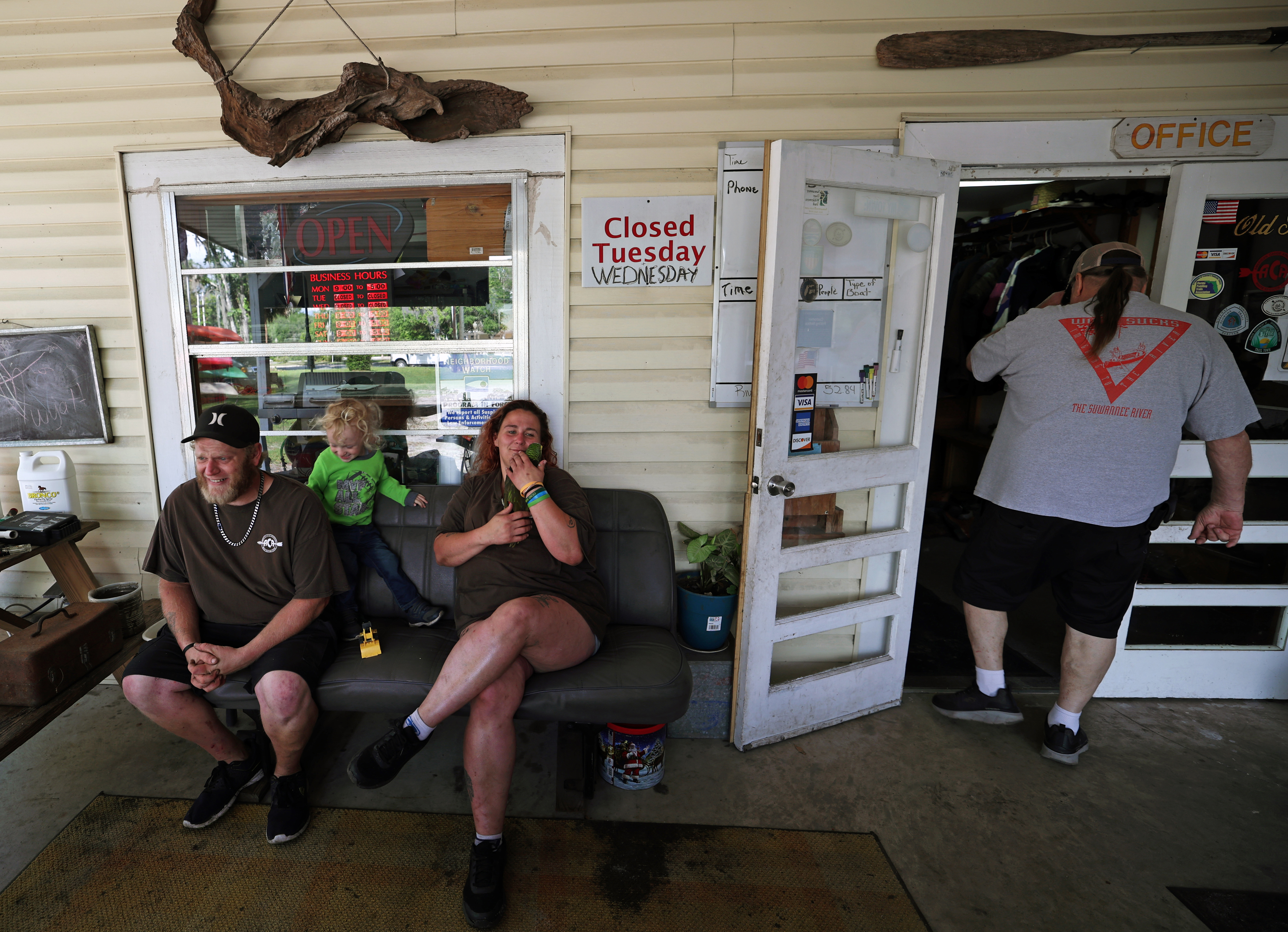John Hannum Jr., Wyatt Hannum, 2, and Summer King sit on the porch of American Canoe Adventures as owner John Hannum Sr. goes inside the building. John Sr. has owned the business in White Springs, Fla. for 30 years.