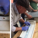 Left: After the eel is placed in a clove oil bath, it is ready to be handled. Center: Dave Sutherland from the Chesapeake Bay field office carefully measures an eel. Right: A small incision is made to implant the acoustic tags.