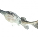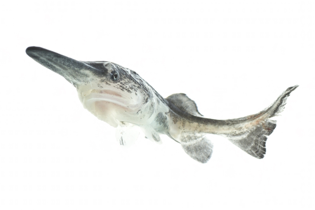 American paddlefish fry 5 week old. Larval fish are swept downstream to deeper pools where they grow to adulthood. Paddlefish can attain length of 10 to 14 inches their first year.