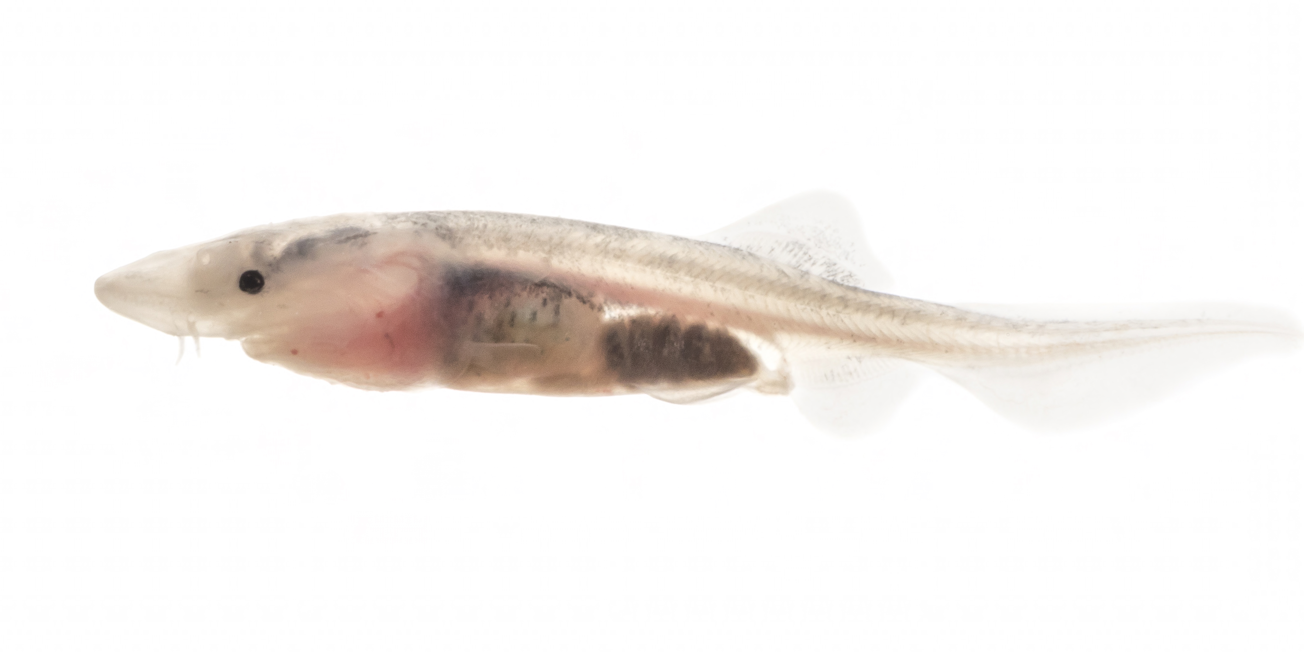 American paddlefish fry 3 week old. Larval fish are swept downstream to deeper pools where they grow to adulthood. Paddlefish can attain length of 10 to 14 inches their first year.