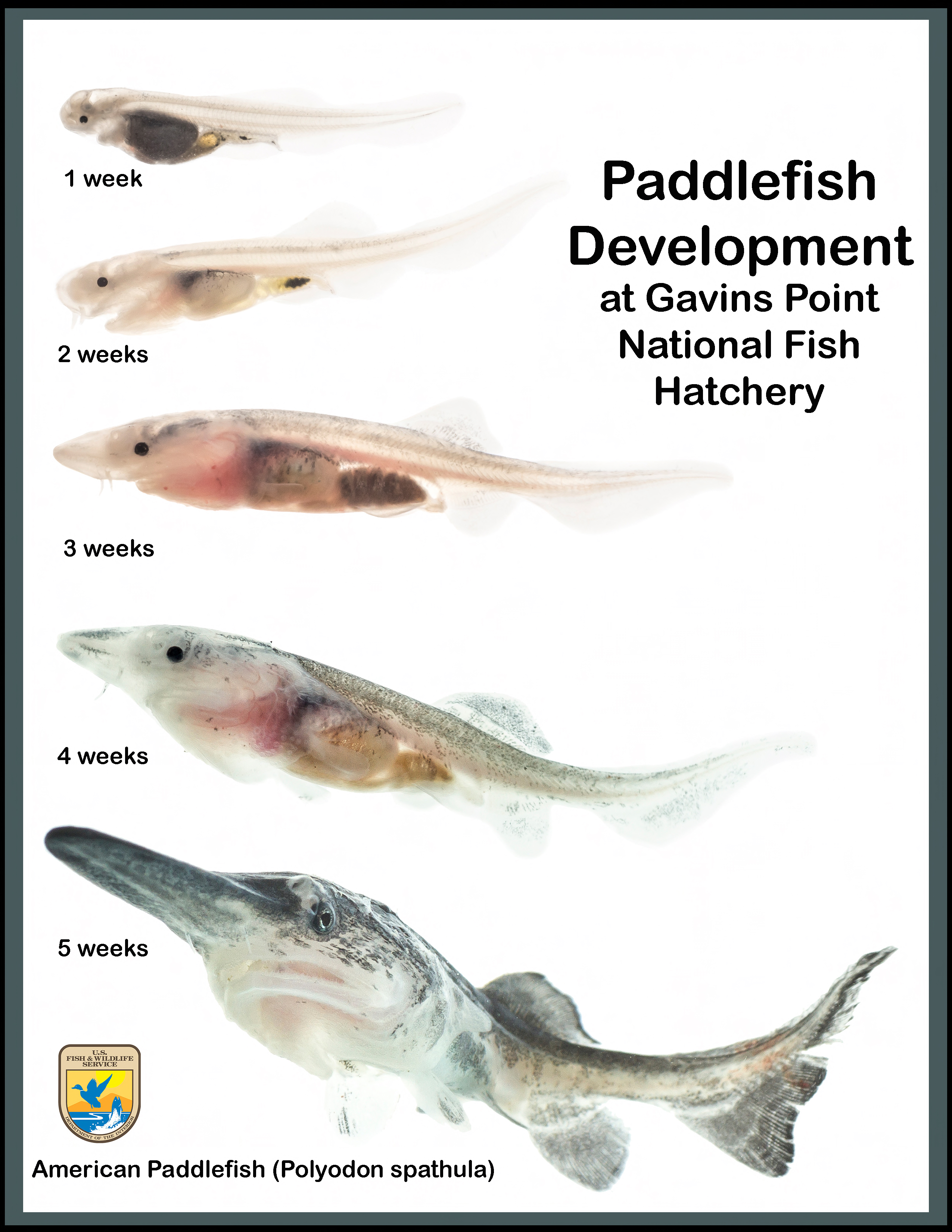 This is a collage of paddlefish from 1 to 5 weeks of development. The American paddlefish is classified as endangered, threatened, or species of concern in several states within its historical range. USFWS has played a key role in the conservation, restoration and preservation of this species. The Gavins Point National Fish Hatchery participate in monitoring and stocking of paddlefish within U. S. waters.