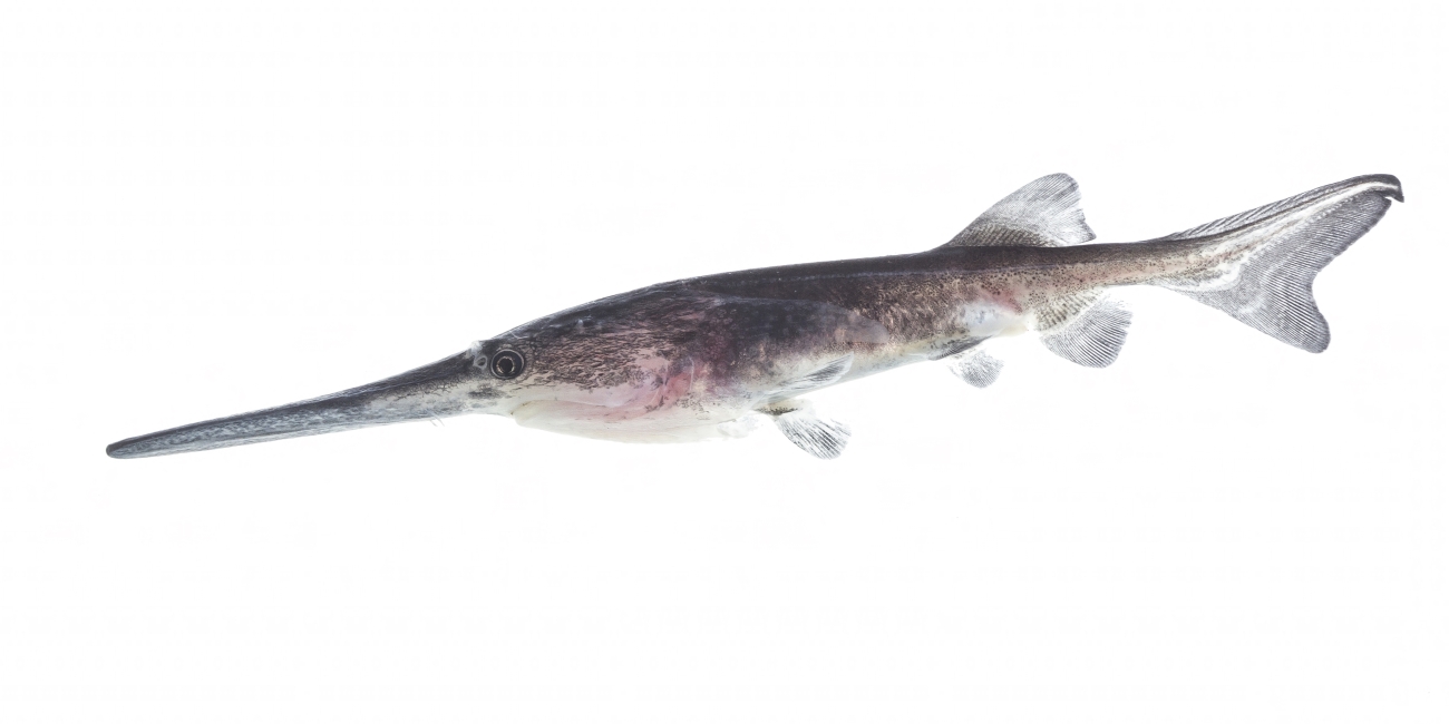 American paddlefish fry 5 week old. Larval fish are swept downstream to deeper pools where they grow to adulthood. Paddlefish can attain length of 10 to 14 inches their first year.