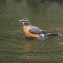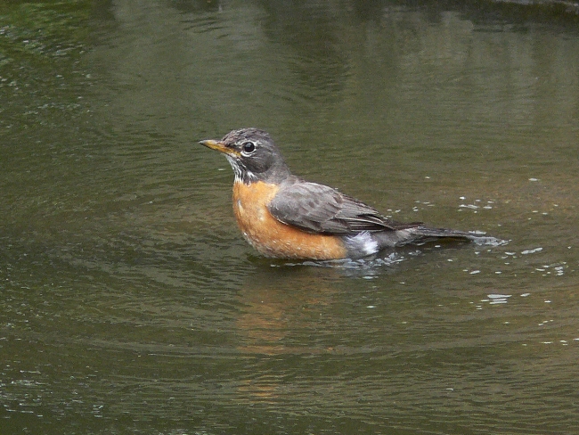 An American robin floats upon water.