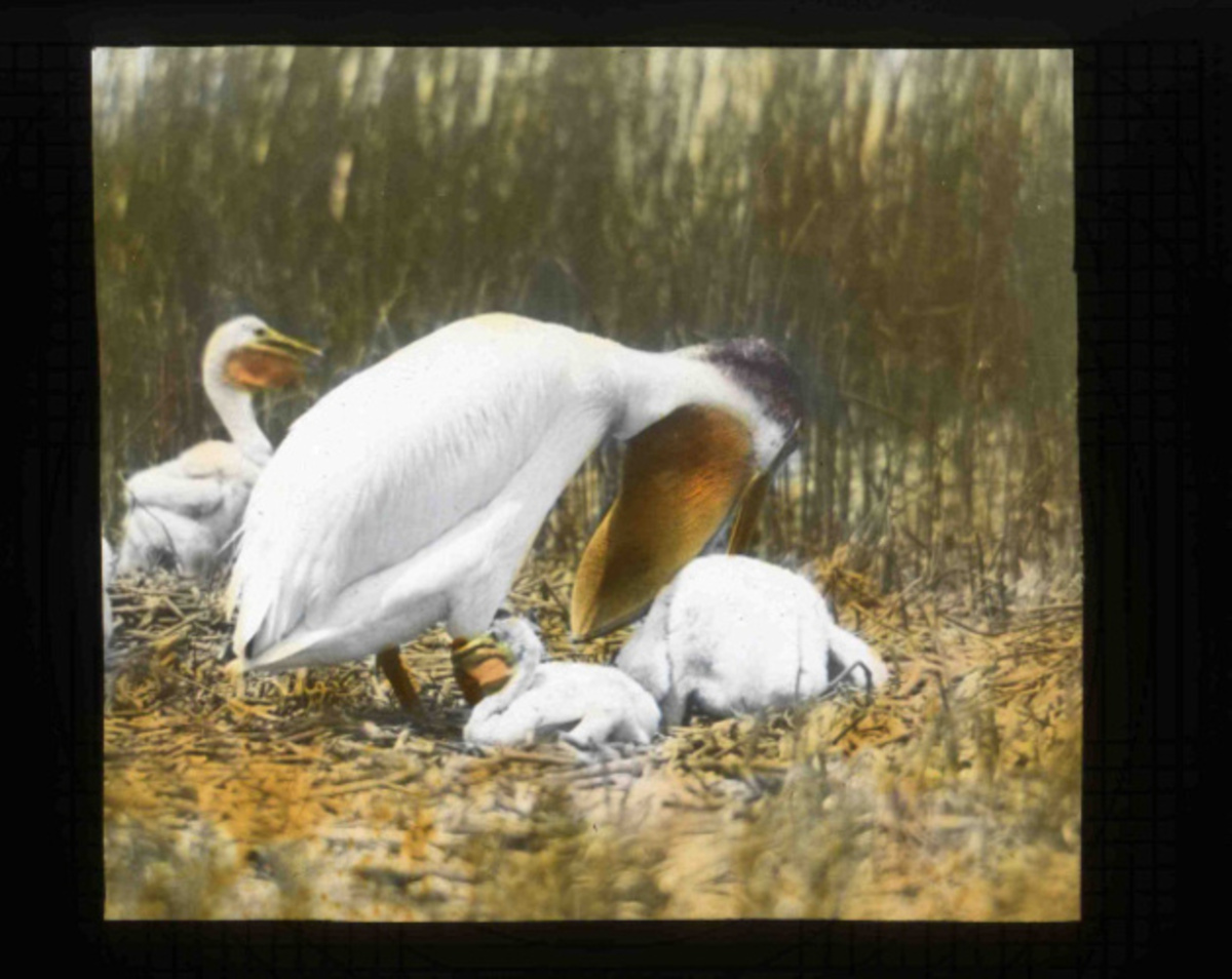 A hand painted glass slide by Finley and Bohlman of an American White Pelican feeding its young at a nest site in Malheur lake. Upon hatching the young pelicans are totally dependent on thier parents for food, warmth, and protection.