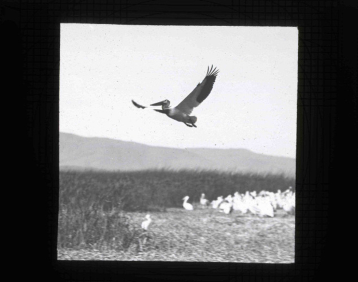 An American White Pelican flying away from its colony at Malheur lake, taken by Finley and Bohlam during a 1908 photography trip to the area.
