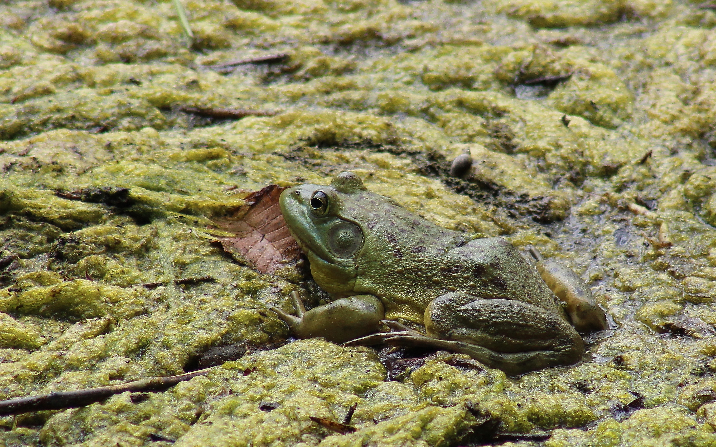 American Bullfrog sitting atop algae in South Capitol Lake trail, Olympia, Washington. Photo courtesy of Photographer Jon. D. Anderson