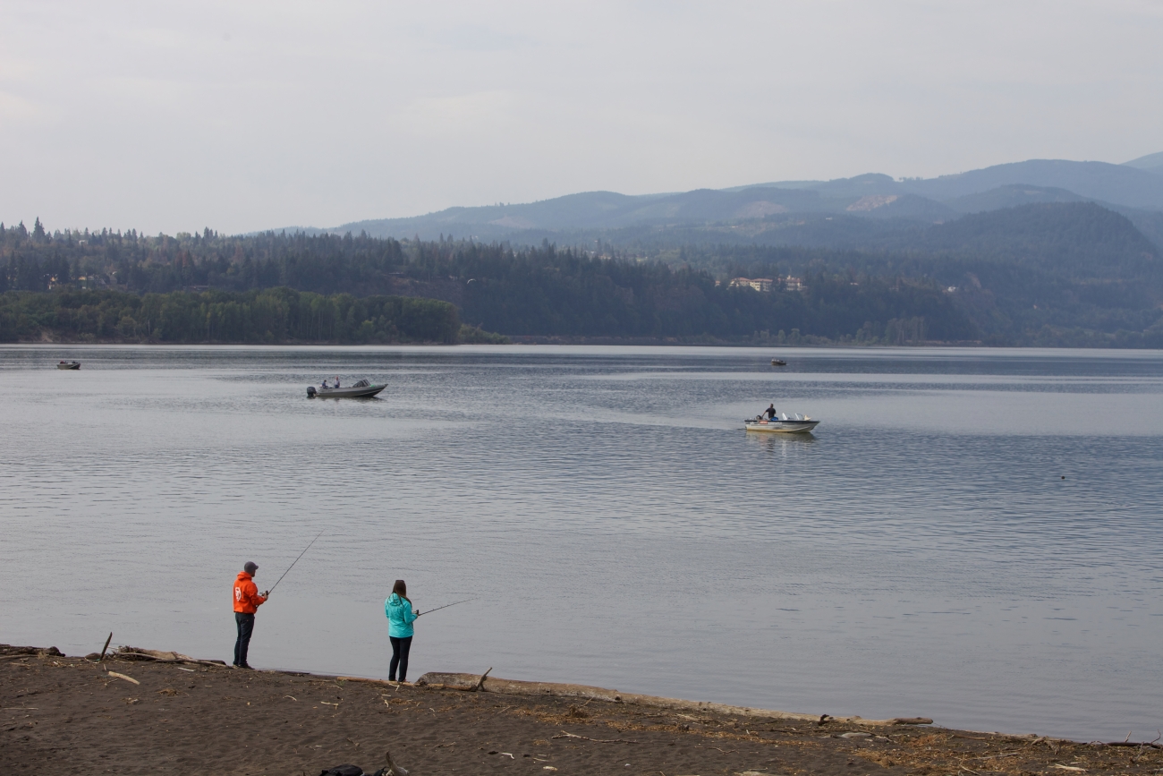 Anglers on shore and in boats fish for Fall Salmon on the Columbia River