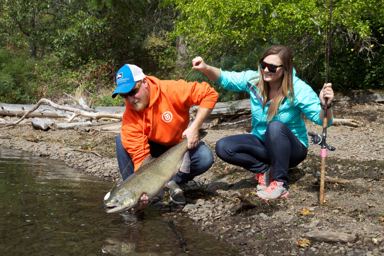 Anglers display their fresh catch, a Fall Chinook salmon, on the Columbia River. Pacific Northwest Fisheries.