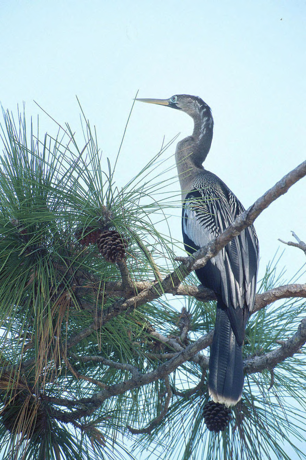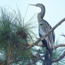 A bird of southern swamps, the Anhinga is known as the Water-Turkey for its swimming habits and broad tail, and also as the Snake-Bird for its habit of swimming with just its long head and neck sticking out of the water.