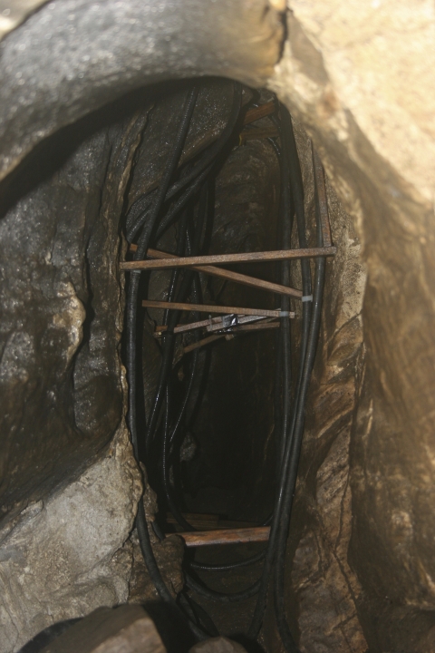 Biologists can identify when bats mounted with PIT (passive integrated transponders) tags pass through this fixed antenna system at the cave's entrance. Studying bat movements is important to understanding the effects of white-nose syndrome, which arouses bats from hibernation.
