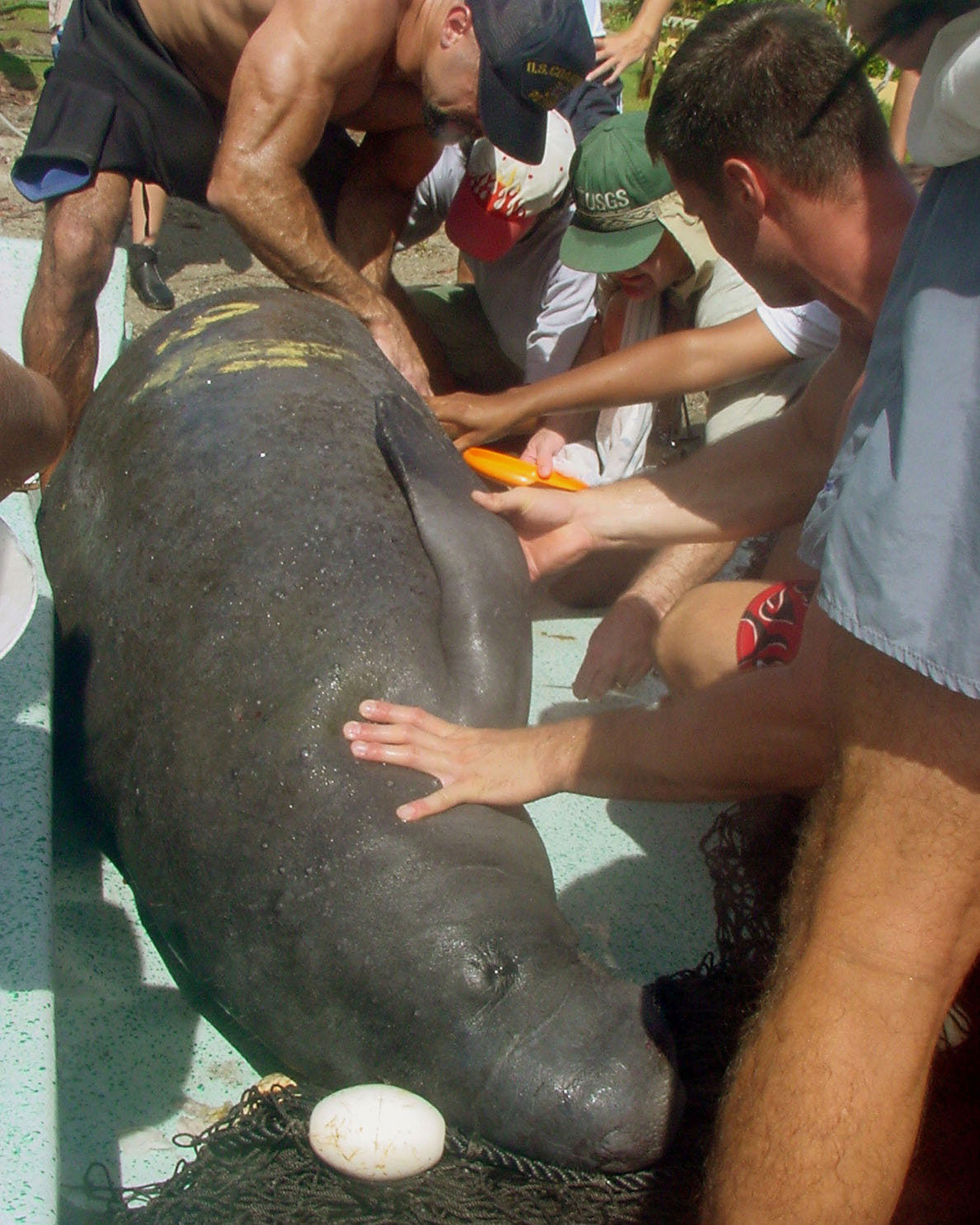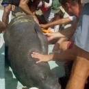Checking captured Antillean manatee