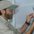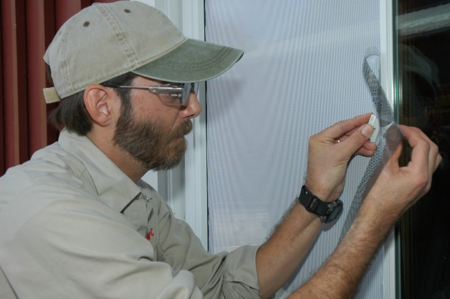 In an effort to curtail the amount of bird strikes on the windows at the U.S. Fish and Wildlife's National Conservation Training Center, a contractor applies anti-bird strike film which discourages birds from flying into windows yet minimally impacts the view from the inside.