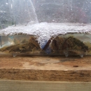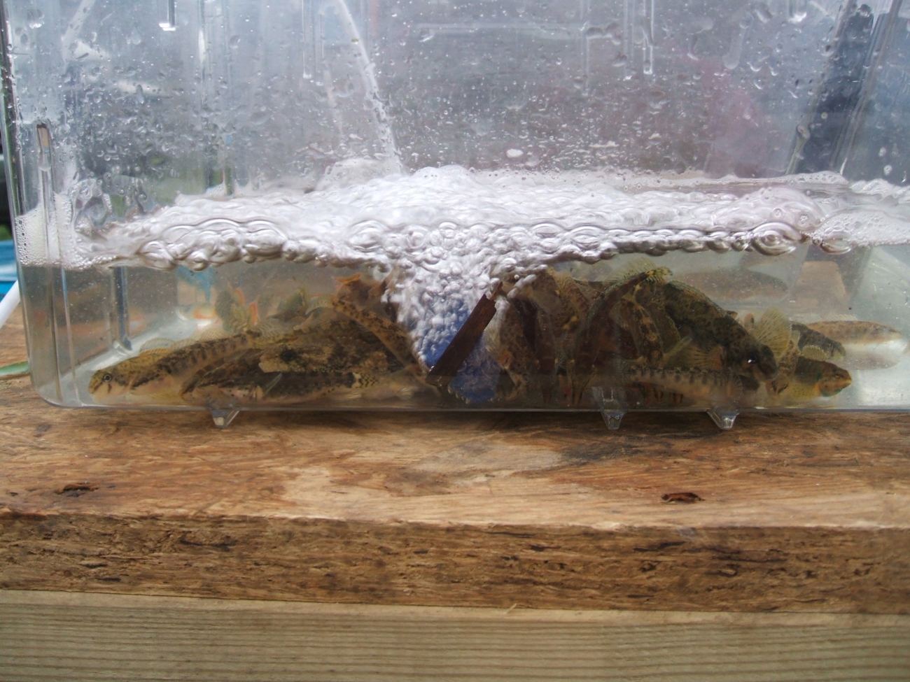 Darters being held in a 10 liter Aquatic Habitat tank for infestation. Enough water is added to just cover the backs of the fish host. Photo: Nathan Eckert, USFWS.