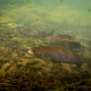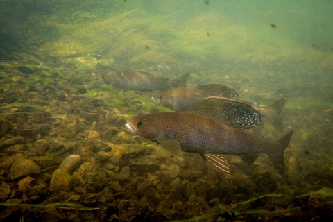 Underwater shot of Arctic grayling. The Arctic grayling (Thymallus arcticus) is one of the most beautiful freshwater fishes of Alaska. Its most striking physical features are the large, sail-like dorsal (back) fin and colorful body markings.