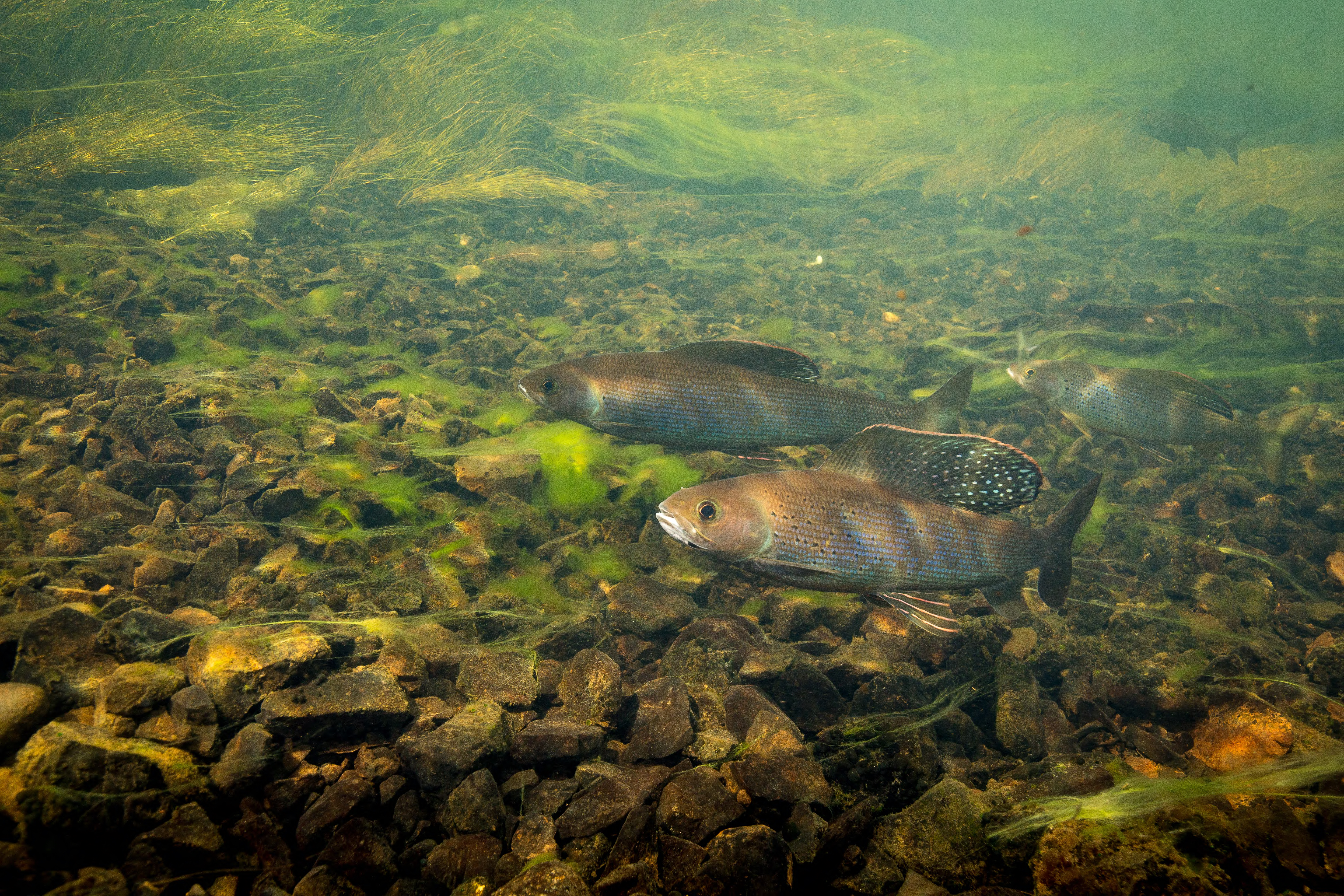 Underwater shot of Arctic grayling. The Arctic grayling (Thymallus arcticus) is one of the most beautiful freshwater fishes of Alaska. Its most striking physical features are the large, sail-like dorsal (back) fin and colorful body markings.