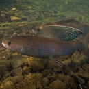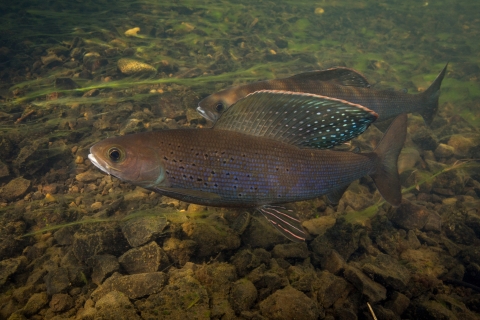 Underwater shot of Arctic grayling. The Arctic grayling (Thymallus arcticus) is one of the most beautiful freshwater fishes of Alaska. Its most striking physical features are the large, sail-like dorsal (back) fin and colorful body markings.