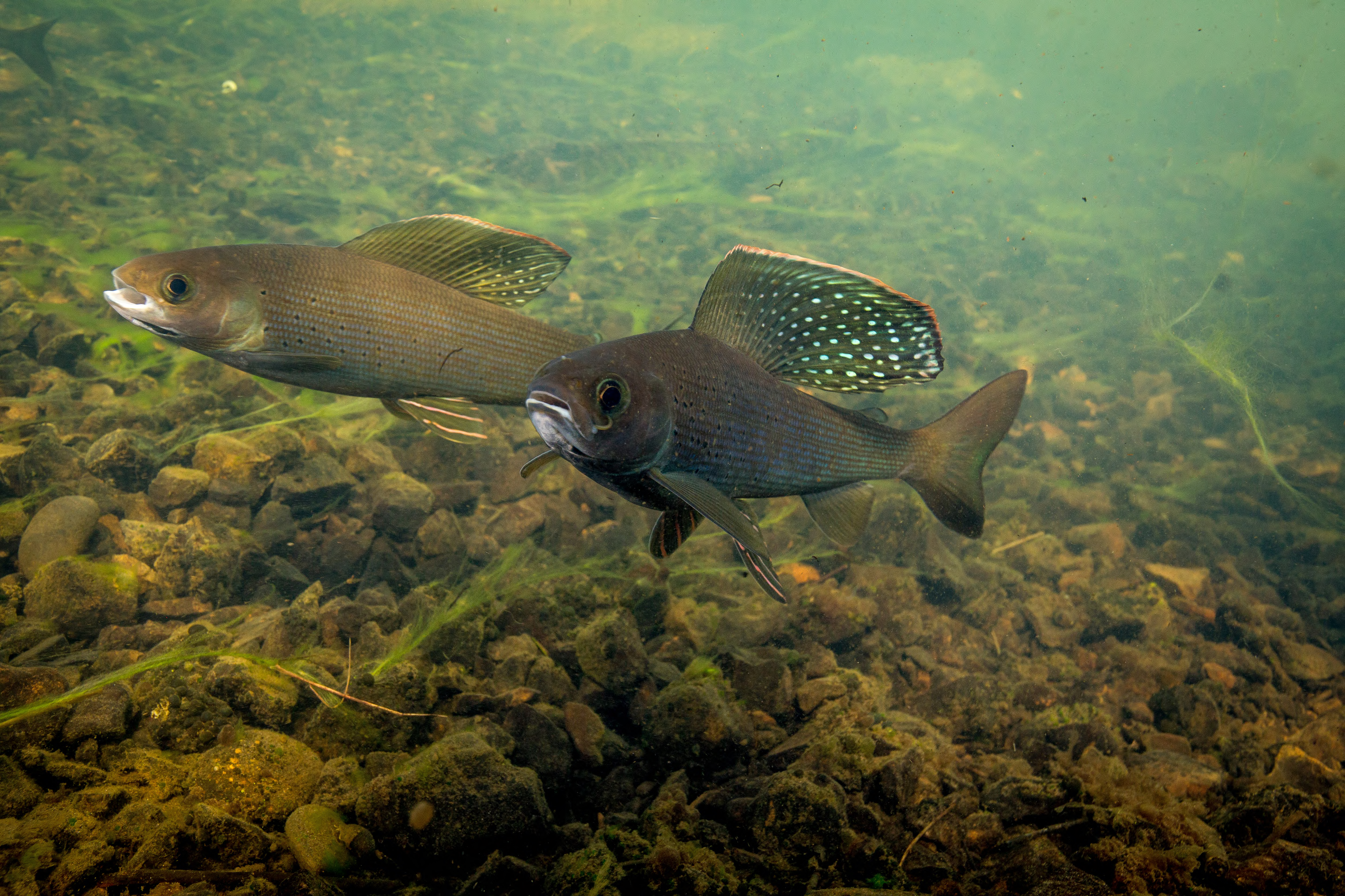 Underwater shot of Arctic grayling. The Arctic grayling (Thymallus arcticus) is one of the most beautiful freshwater fishes of Alaska. Its most striking physical features are the large, sail-like dorsal (back) fin and colorful body markings.